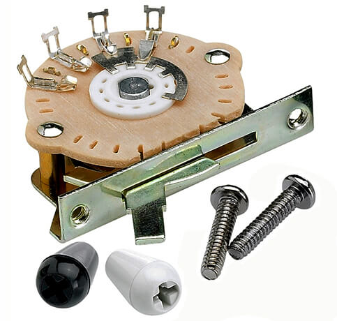 Original Fender 5-way pickup selector used on USA / Mexico Stratocasters and other similar style guitars with three pickups. Used for S/S/S and H/S/S pickup configurations. Fits all Fender / Squire and most other instruments with 3 pickups.